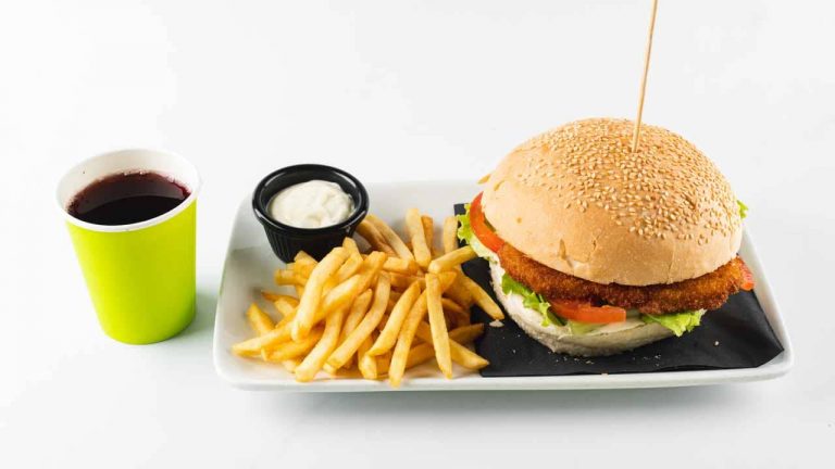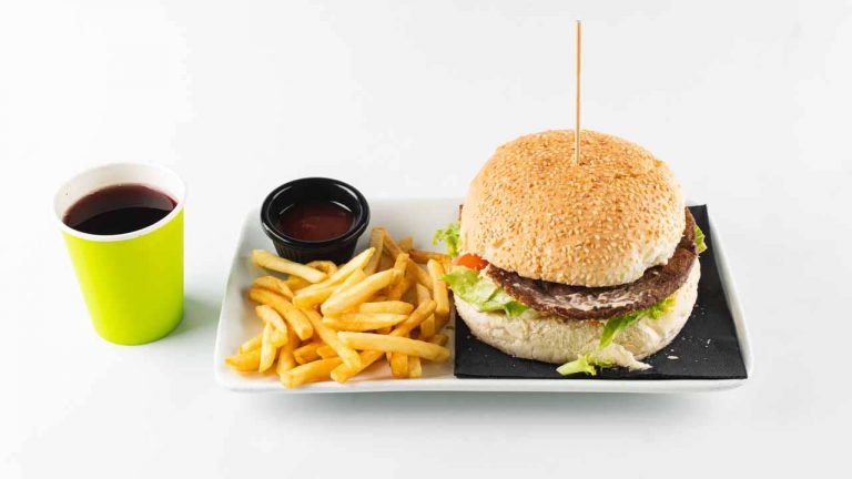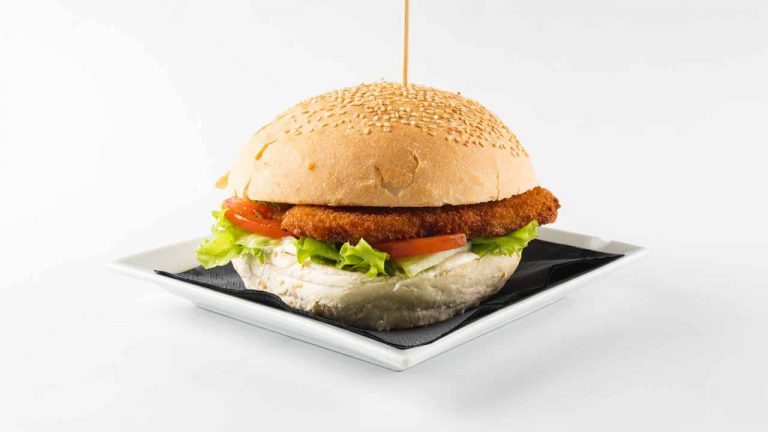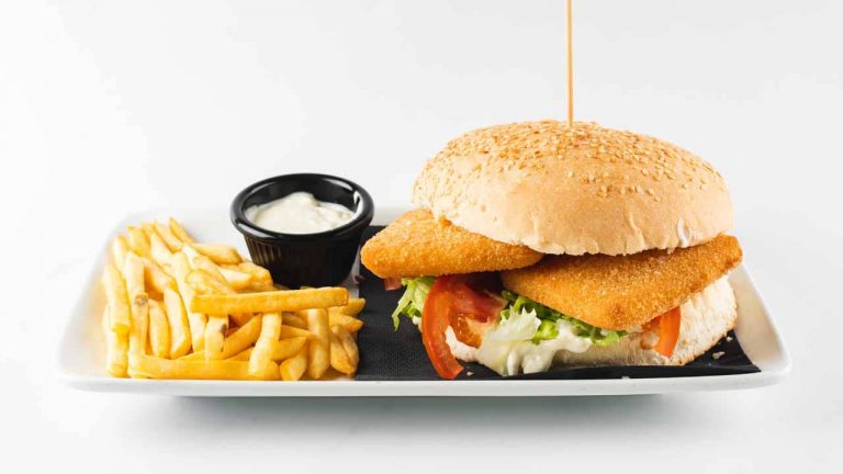 1 x burger, fried cheese, ufo spread, salad, tomato, tartar sauce, onion +french fries
