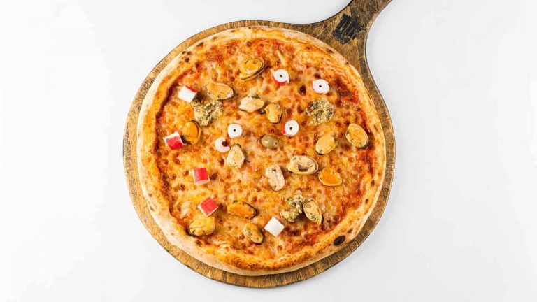 tomatoes, mozzarella, oregano, olive, seafood, sauce triestino