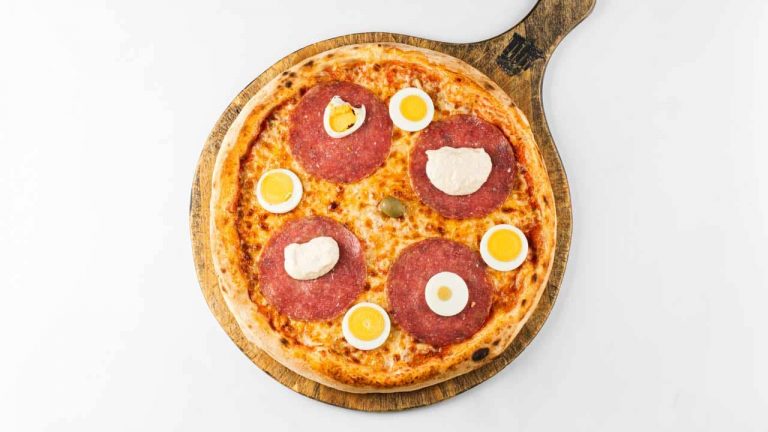 tomatoes, mozzarella, oregano, olive, ham , mushrooms, horseradish, egg