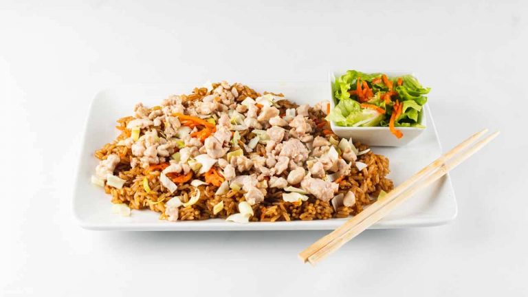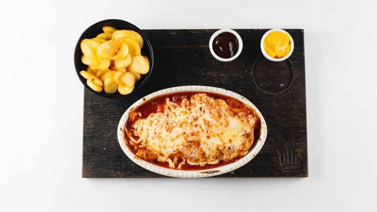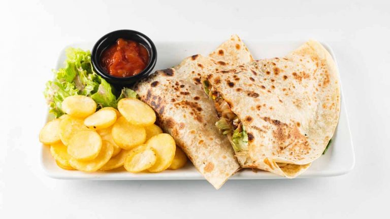 Nadev: piščančje meso, tortilja ø30 cm zložena v ognjevarno posodo in pečena v peči, mozzarella, sladka smetana, rdeča salsa